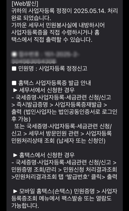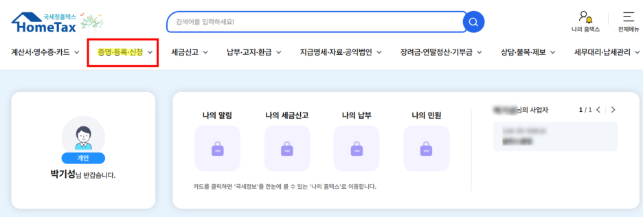 좌측에 [사업자등록 신청, 정정, 휴폐업] 클릭
